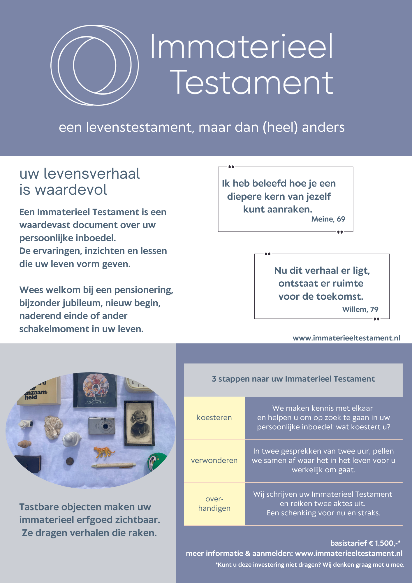 Wilt u uw familie enthousiast maken om oma een Immaterieel Testament cadeau te geven voor haar 80ste verjaardag? Wilt u uw collega’s laten weten dat het Immaterieel Testament een mooie manier is om het licht te laten schijnen op jullie doelgroep? Of wilt u er zelf eentje en moet u nog even wennen aan dat idee? Voor al dit soort situaties maakten we deze flyer. Om verder te delen.